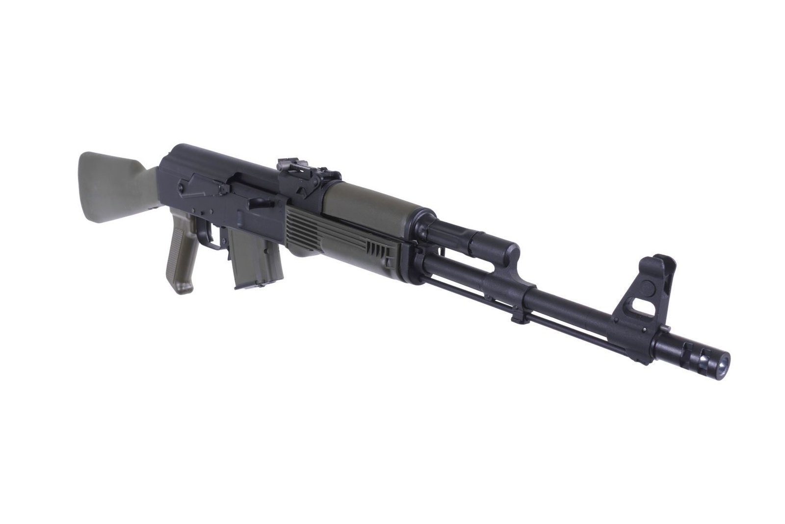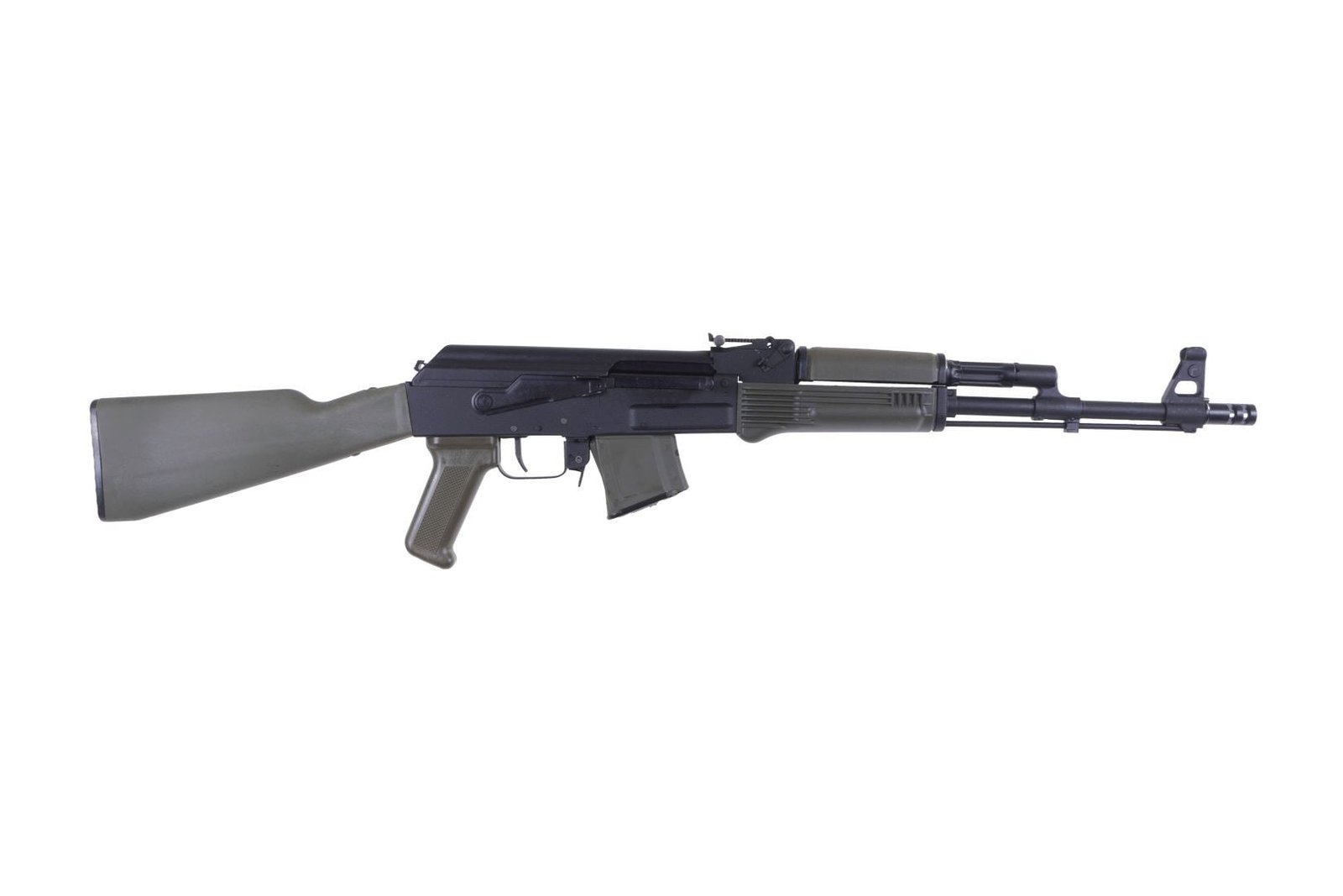 Arsenal SAM7R-62 7.62x39mm Semi-Automatic Rifle with OD Green Furniture and OD Green 10rd Magazine. Includes AK-351 Muzzle Brake milled and forged receiver FIME Group enhanced fire control group 16.3″ chrome lined hammer forged barrel 14x1mm left-hand threads removable muzzle brake cleaning rod bayonet lug black polymer furniture intermediate length buttstock scope rail one OD Green 10 round magazine sling oil bottle and cleaning kit.