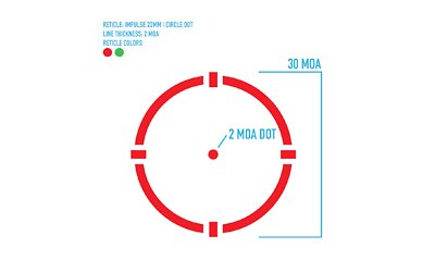 Helping shooters achieve lightning fast target acquisition, the Impulse 1×22 Dot Sight is ideal for target shooting and hunting on rifles and shotguns. Red or green reticle illumination lets shooters choose their preferred circle dot reticle color for different situations. Featuring an aluminum construction and matte black finish, the Impulse 1×22 offers shockproof, fog proof and IPX5 weatherproof protection. Weighing in at just 7.5 oz., this Texas designed optic is perfect for your next SBR or lightweight MSR build. 15-240 hours of battery life (depending on setting) is achieved from one CR2032 battery. The Impulse can handle recoil up to .50 caliber and comes with flip up lens caps and battery.