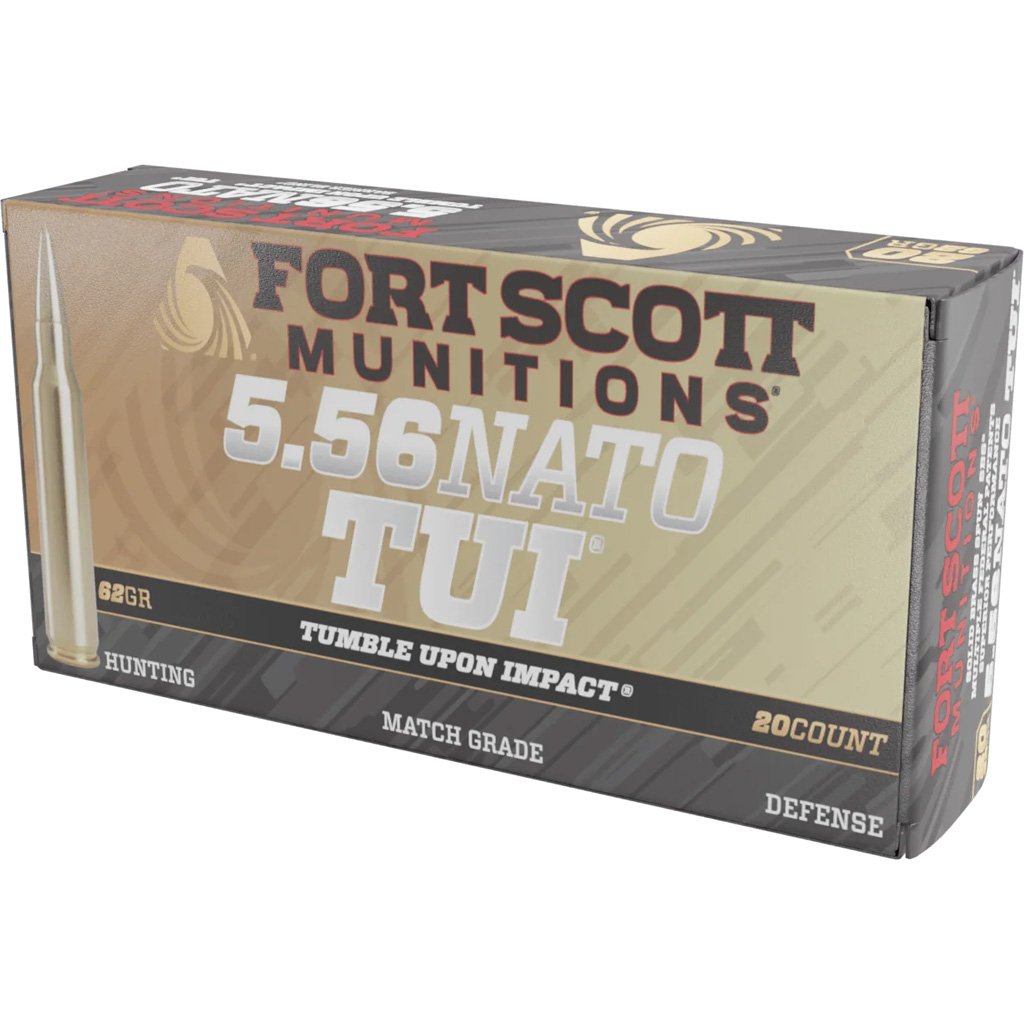 Fort Scott Munition Rifle Ammo 5.56 NATO 62 gr. Tumble Upon Impact bullet. Brass 20 rd. 3200 FPS (24″ BBL)