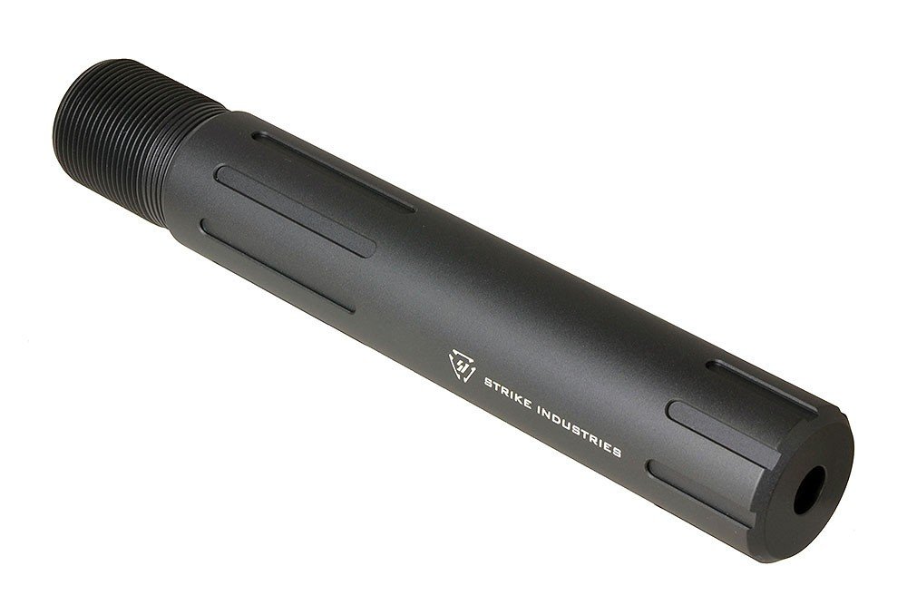 Strike Industries Carbine Length Pistol Receiver Extension Black Material: 7075-T6 Aluminum Package includes: 1x Slick Carbine Pistol Receiver Extension Features: Type II Anodized in FDE, RED, BLUE Type III Anodized in BLACK Fits onto any standard AR receiver. Supported buffer retainer Built-in QD socket at rear