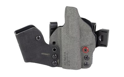 An ergonomic, mission-adjustable, RDS-compatible, multi-positional, deep concealment IWB hybrid thermoplastic holster. Its distinctive features enable concealed carry for a wide range of handgun fits from various carry positions while allowing a full firing grip prior to drawing. The design includes passive retention and adjustable tension, enabling a finely tuned fit and smooth draw. This evolution of the IncogX features a series of clips that provide more adaptability to the user while maintaining the original goals of improved grip, concealment, and function. The clips open outward and slide down with the holster, naturally locking over the belt. An actuated finger tab flexes to open, allowing quick installation or removal from the belt. An improved clip strut design combines functionality with customized concealment shims that can be easily installed or removed without tools. All IncogX models come with clip strut shims in three different concealment sizes: 1/8″, 1/4″, and 3/8″.